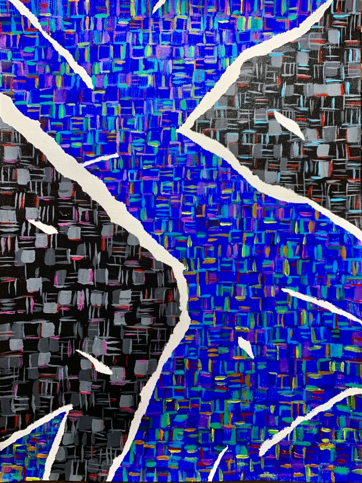 Looking around Detroit where I live, it’s easy to take history at face value – the evidence of brokenness is everywhere. However, one quick peek under the surface and you’ve entered a complicated dimension that begs you to seek the truth about civil rights history and systemic racism. For many people, it’s easier to avoid the truth and the tension than it is to face it. But as Dr. King said, “I must confess that I am not afraid of the word ‘tension.’ I have earnestly opposed violent tension, but there is a type of constructive, nonviolent tension which is necessary for growth. Just as Socrates felt that it was necessary to create a tension in the mind so that individuals could rise from the bondage of myths and half-truths to the unfettered realm of creative analysis and objective appraisal, so must we see the need for nonviolent gadflies to create the kind of tension in society that will help men rise from the dark depths of prejudice and racism to the majestic heights of understanding and brotherhood.” The paper tears in my painting not only reference the scraps of paper on which Dr. King wrote his letter from the jail, but also the tension of the mind and society.